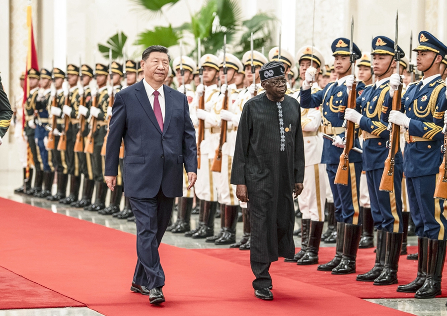 9月3日下午,国家主席习近平在北京人民大会堂同来华出席中非合作论坛北京峰会并进行国事访问的尼日利亚总统提努布举行会谈。这是会谈前,习近平在人民大会堂北大厅为提努布举行欢迎仪式。