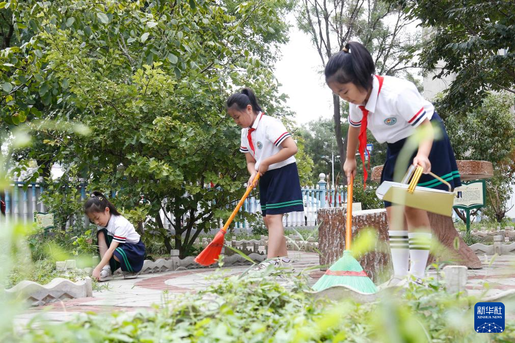 9月2日,在河北省邢台市南和区第一小学“开学第一课”活动上,学生参加户外劳动。