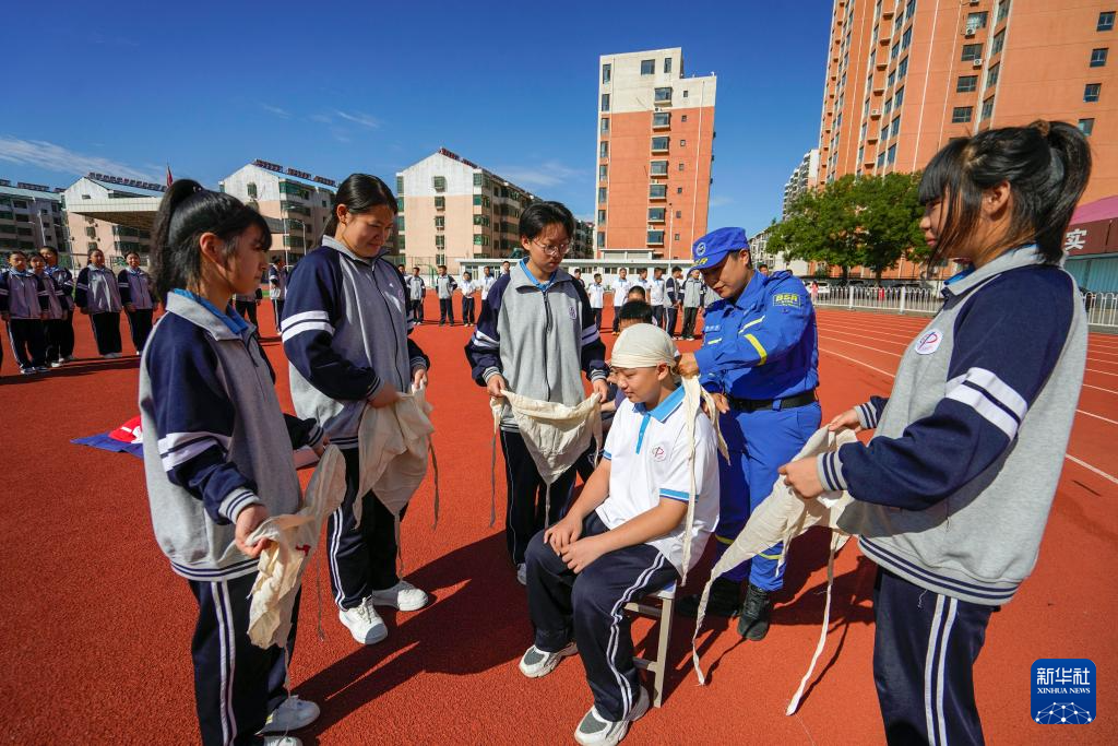 9月2日,在河北省遵化市第二中学“开学第一课”活动上,蓝天救援队队员为学生们讲解急救包扎技能。