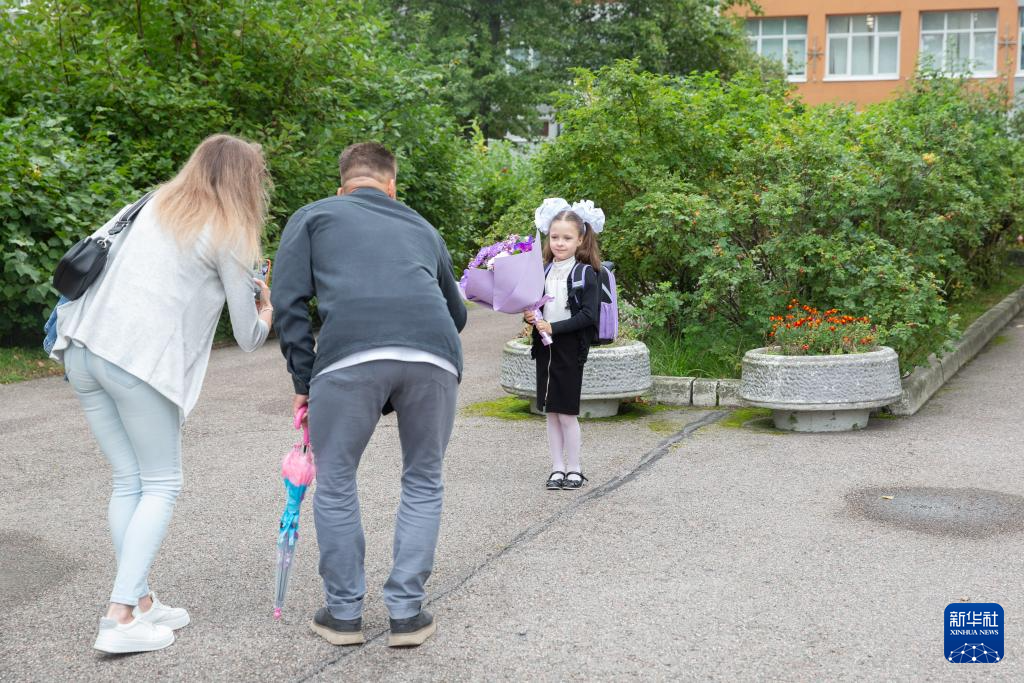 9月2日,俄罗斯圣彼得堡第188学校一名学生的家长为孩子入学拍照留念。