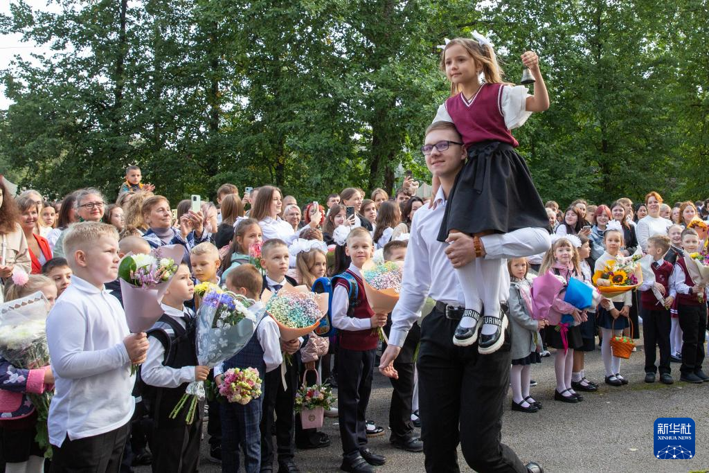 9月2日,俄罗斯圣彼得堡第188学校的一名一年级新生坐在一名高年级学生的肩上摇动铃铛,象征新学期开学。