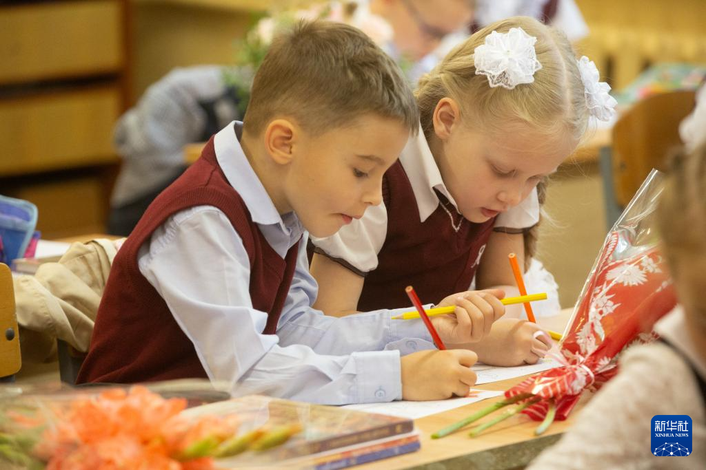 9月2日,俄罗斯圣彼得堡第188学校的一年级新生在教室内绘画。