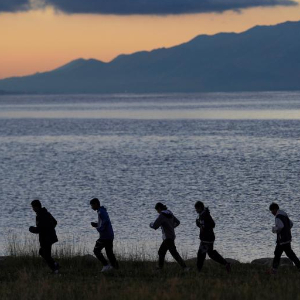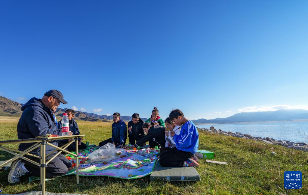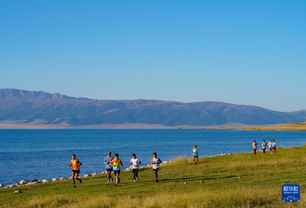 运动员在赛里木湖畔进行野外训练(8月31日摄)。