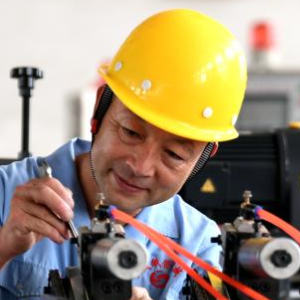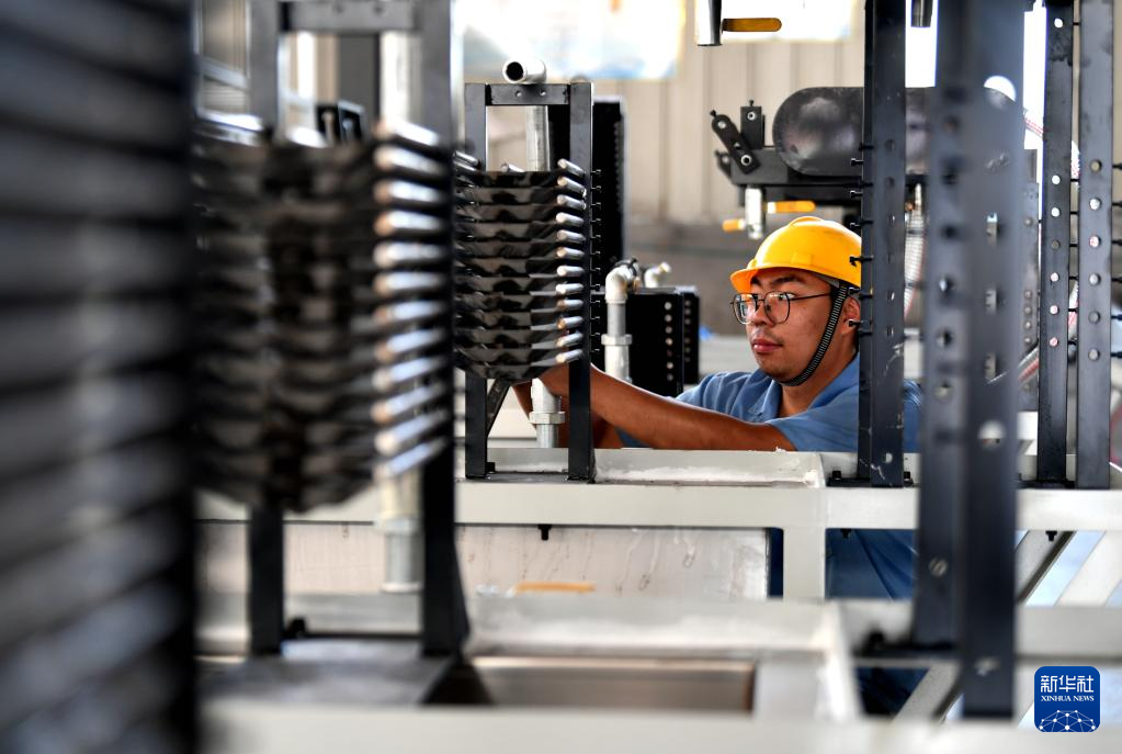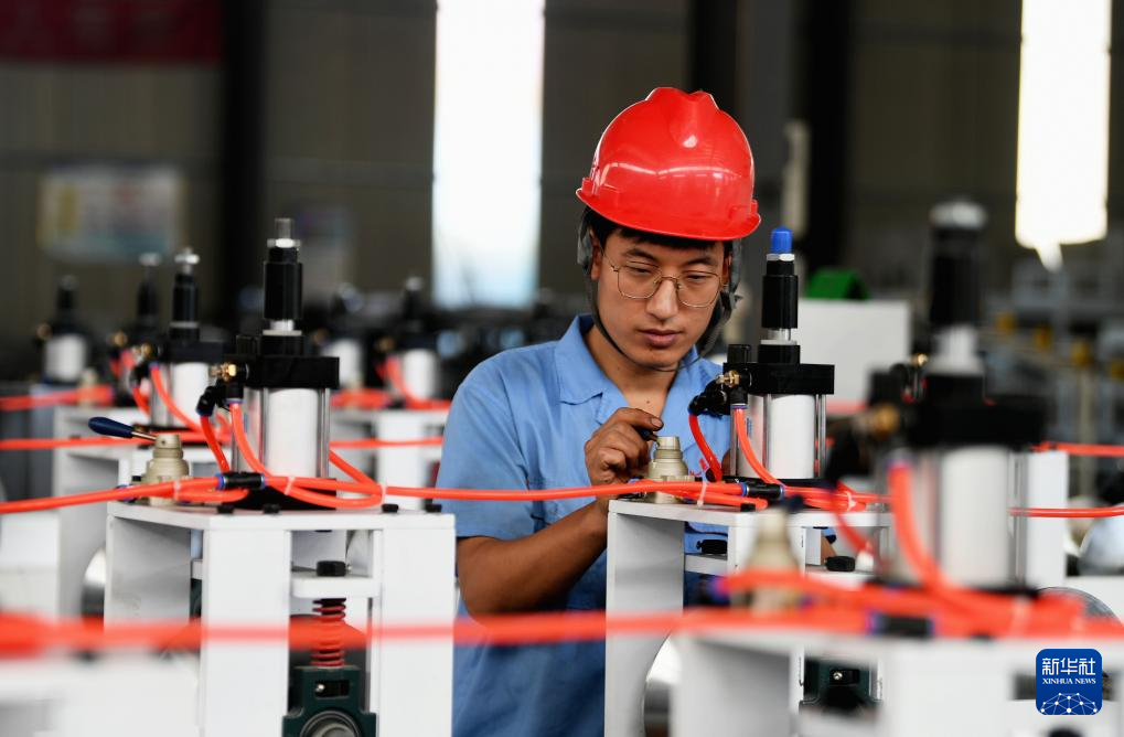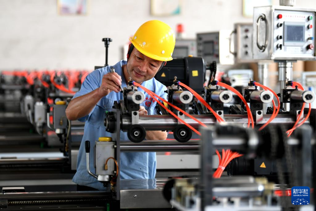 9月4日,工人在阜城县码头镇一家包装机械制造企业生产车间内调试设备。