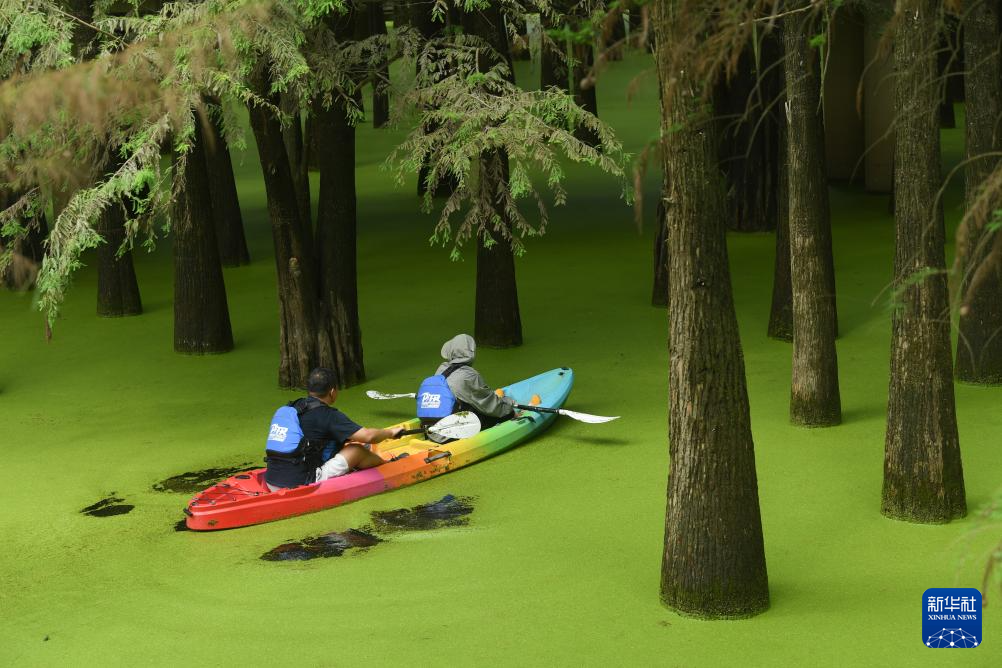 初秋时节,杭州青山湖水上森林近百亩池杉、落羽杉和水面的浮萍相映成趣,呈现出幽静的生态景观。