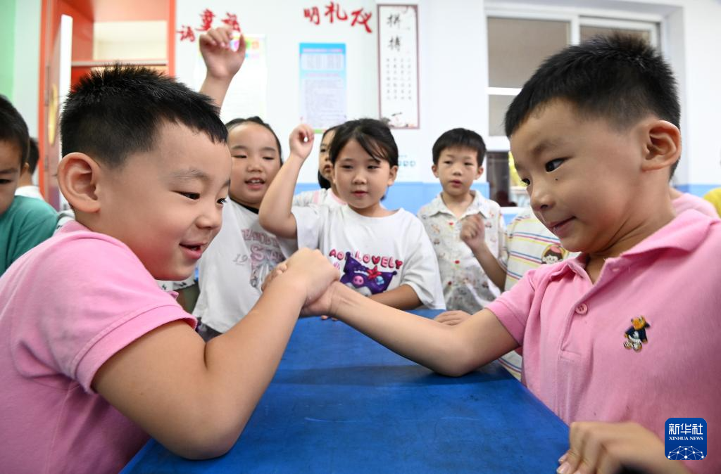 9月4日,在河北省邯郸市邯山区渚河路小学,一对双胞胎新生在课间做游戏。