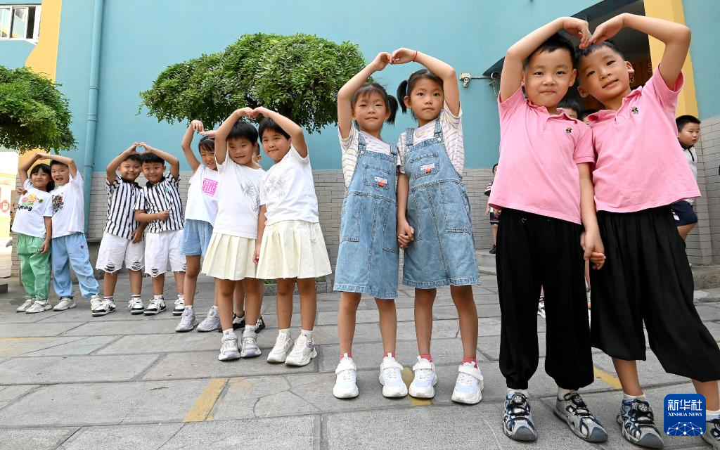 9月4日,河北省邯郸市邯山区渚河路小学的双胞胎新生在一起玩耍。