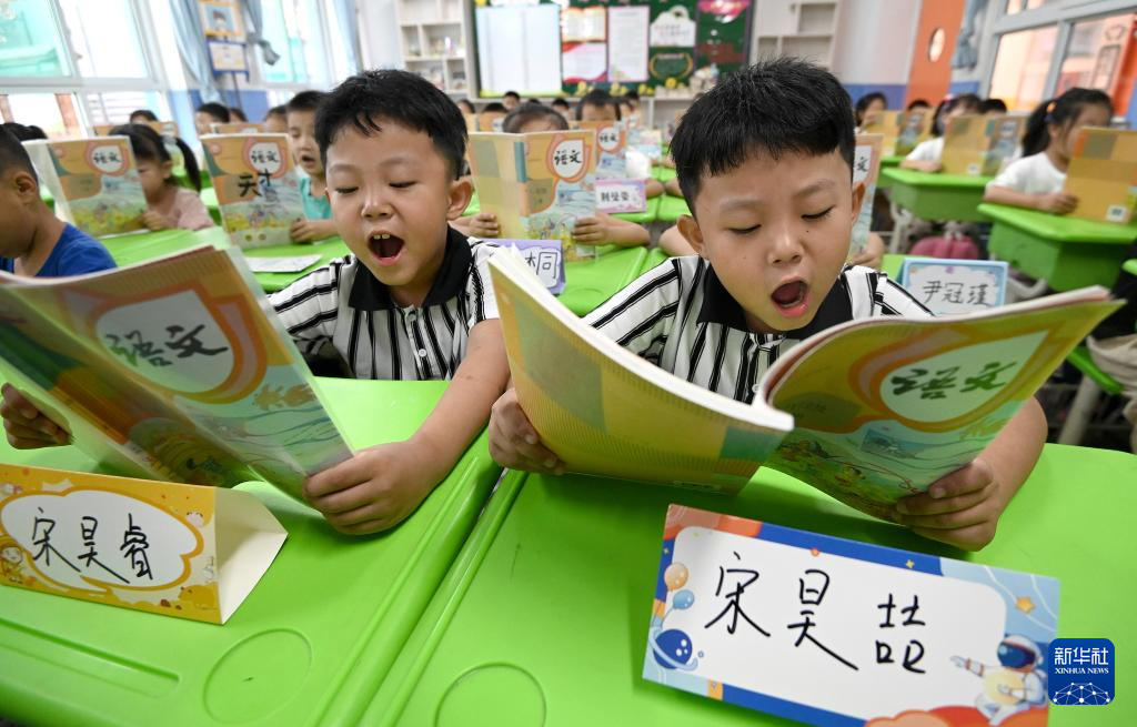9月4日,在河北省邯郸市邯山区渚河路小学,一对双胞胎新生在教室里阅读课文。