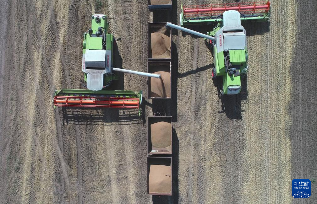 9月3日,在哈萨克斯坦首都阿斯塔纳附近的农田,联合收割机收获小麦(无人机照片)。