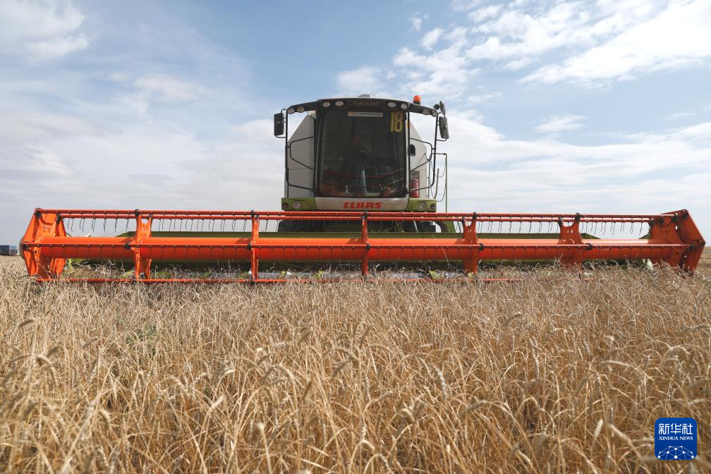9月3日,在哈萨克斯坦首都阿斯塔纳附近的农田,联合收割机收获小麦。