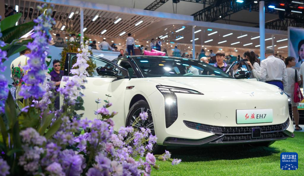 7月13日,观众在第21届长春国际汽车博览会的红旗品牌展区参观EH7车型。