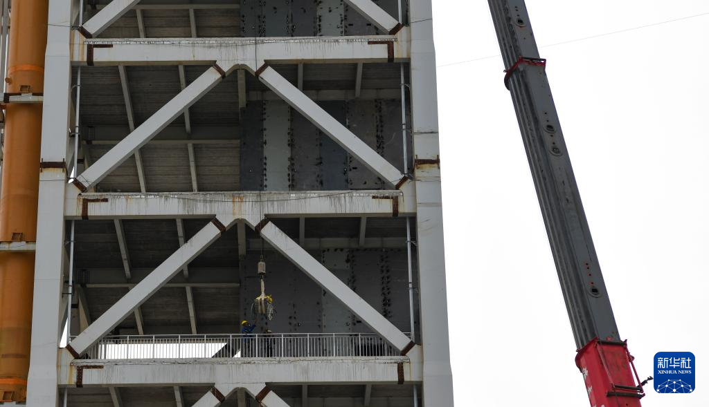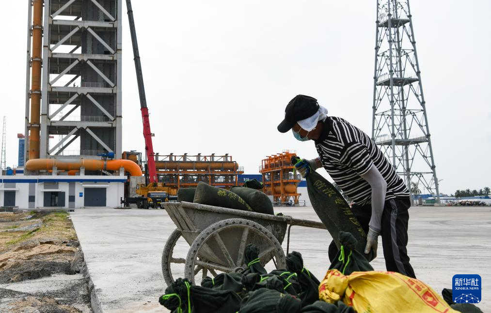 9月4日,在海南商业航天发射场二号发射工位,工作人员将沙袋吊运到塔架上。