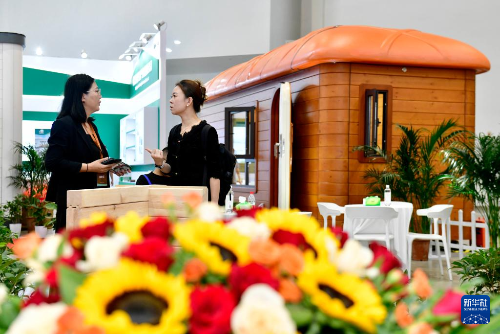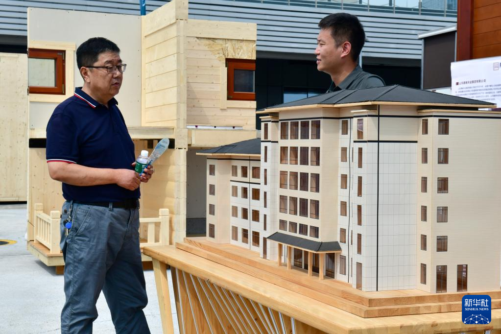 9月5日,在中国(日照)木结构和旅居产业展览会上,参展商在推介产品。