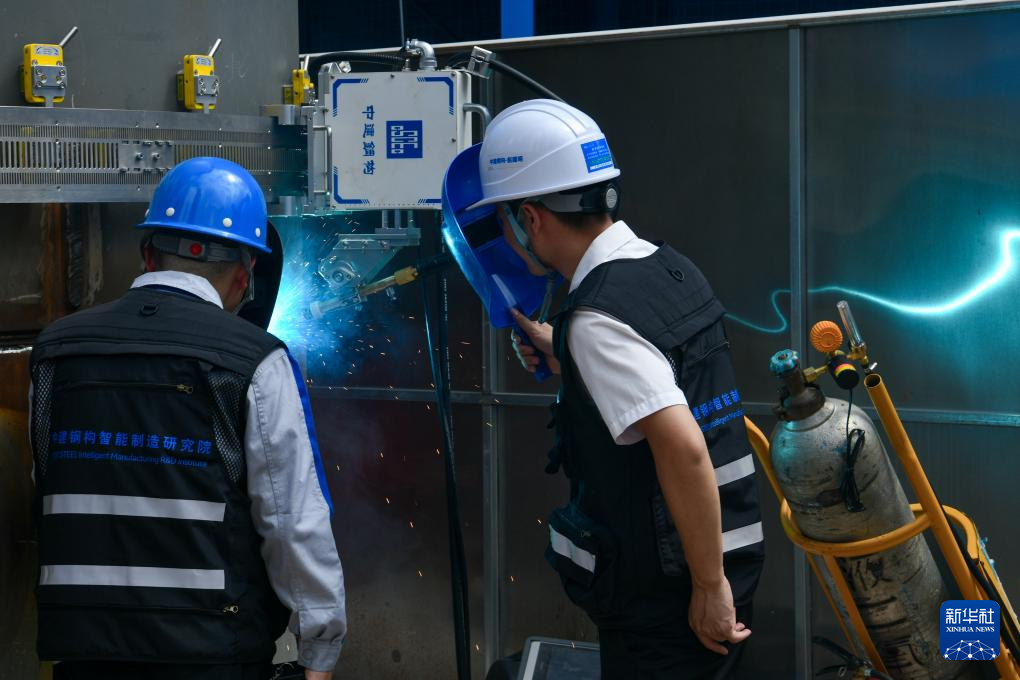 9月5日,工作人员遥控智能焊接机器人进行焊接作业。