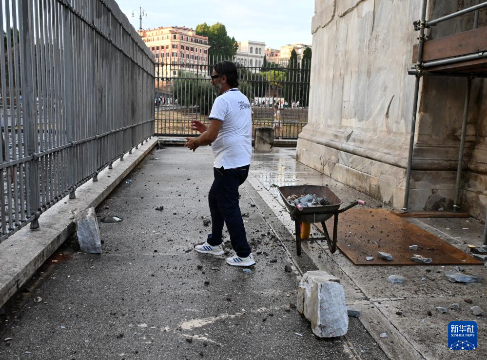9月3日,在意大利首都罗马,工作人员清理君士坦丁凯旋门在雷击中掉落的碎石。
