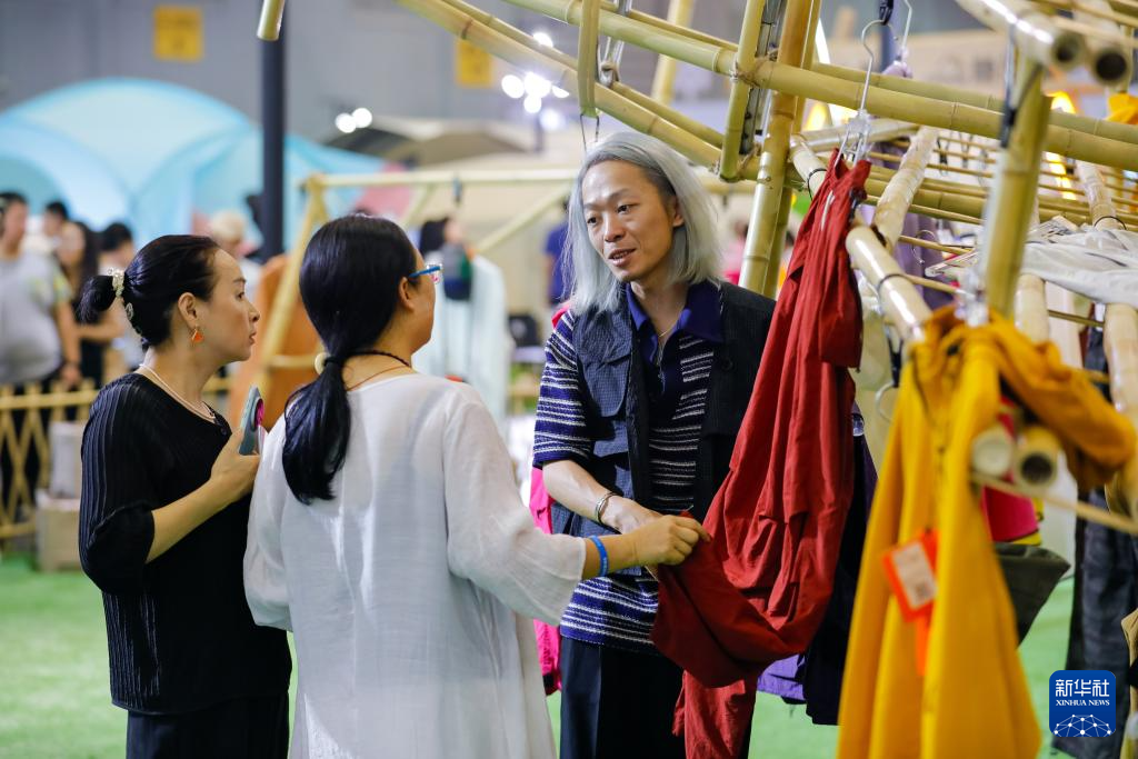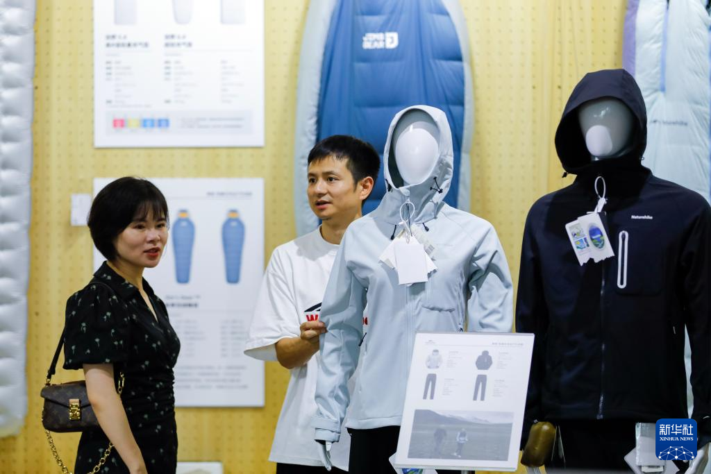 9月6日,在CLE中国(成都)户外露营生活展上,一名工作人员(右)向参观者介绍户外服装。