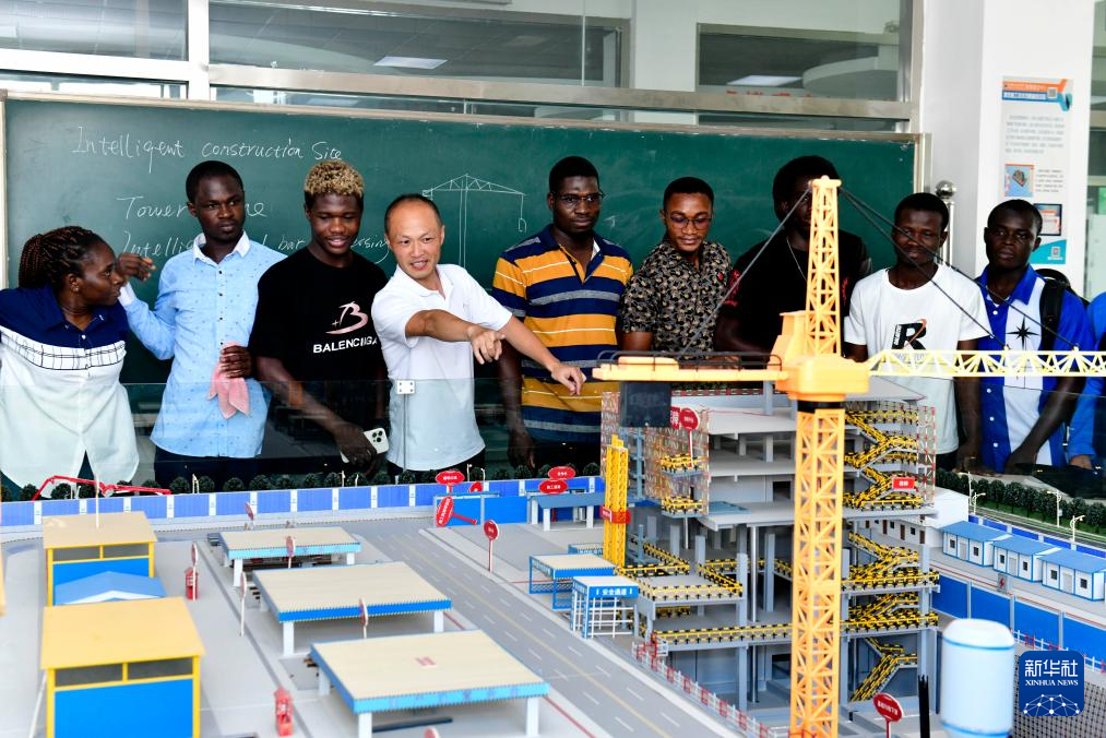 9月5日,在日照职业技术学院智慧建造中心,建筑工程系老师马方兴(左四)在模拟沙盘前给加纳学生授课。