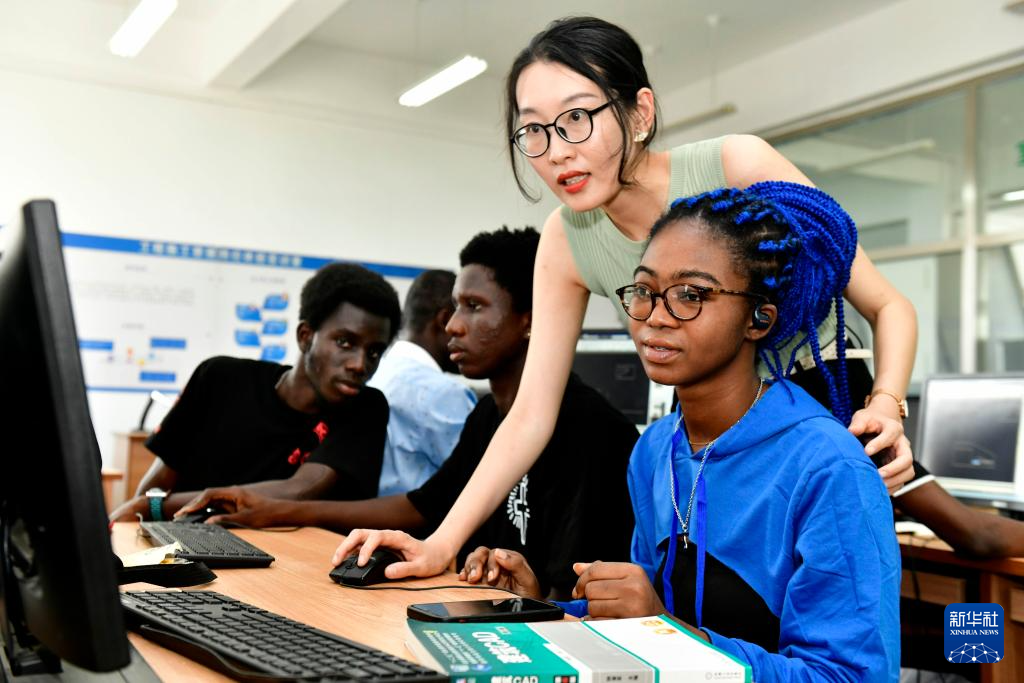 9月5日,在日照职业技术学院智慧建造中心,建筑工程系老师希晓萌(右二)在指导加纳学生进行建筑CAD绘图。