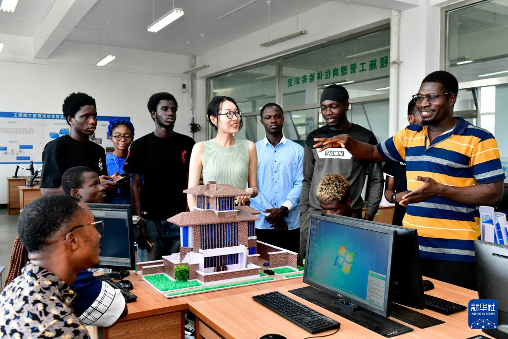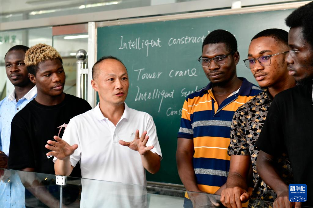 9月5日,在日照职业技术学院智慧建造中心,建筑工程系老师希晓萌(右四)和加纳学生进行课间交流。