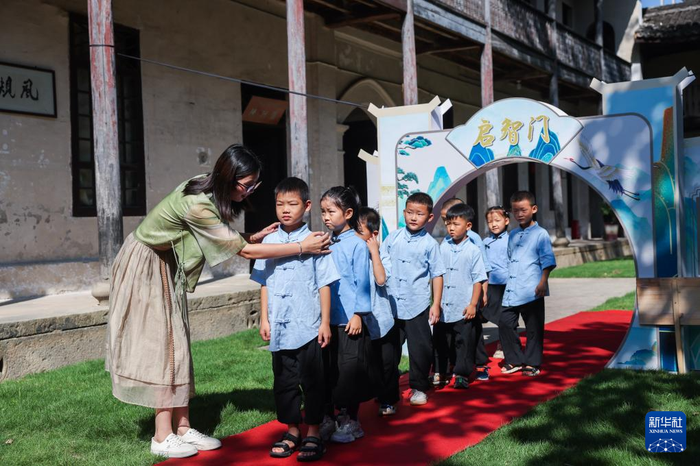 9月6日,斯民小学的老师为一年级新生在参加新生开笔礼前“正衣冠”。