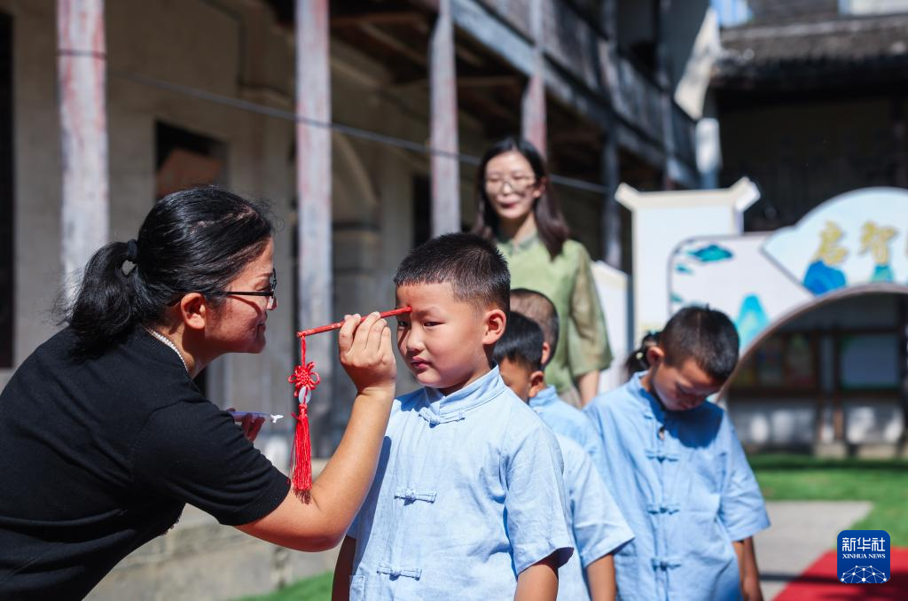 9月6日,斯民小学的老师给一年级新生点朱砂。