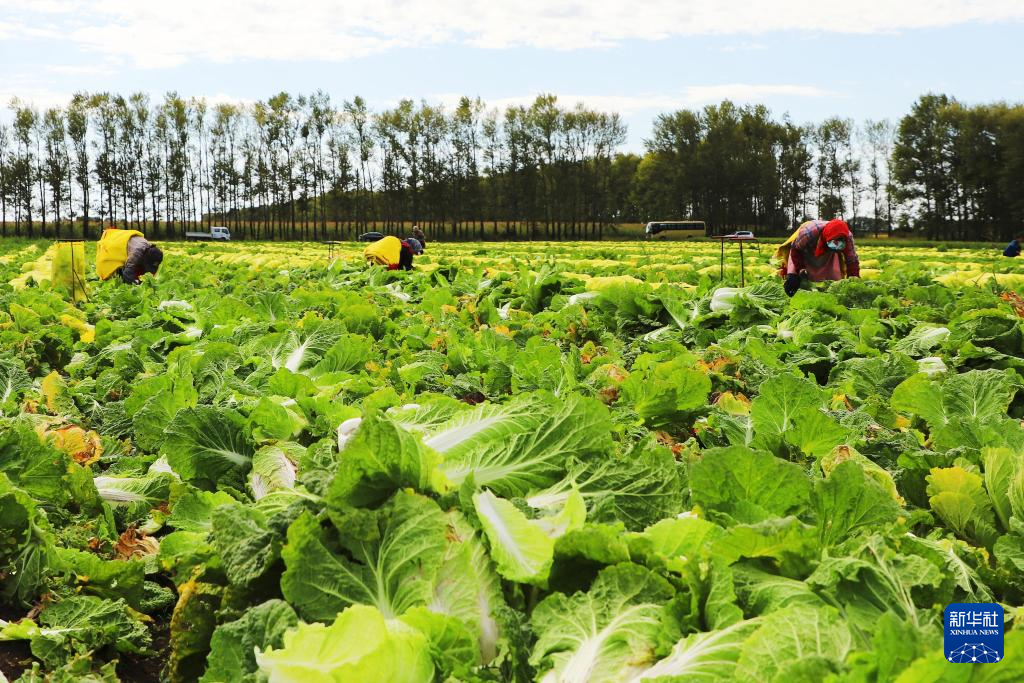 9月6日,工人在北大荒集团黑龙江红星农场有限公司第一管理区有机白菜专属种植基地收获白菜。
