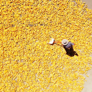 9月6日,山东省临沂市平邑县卞桥镇农民在晾晒玉米(无人机照片)。