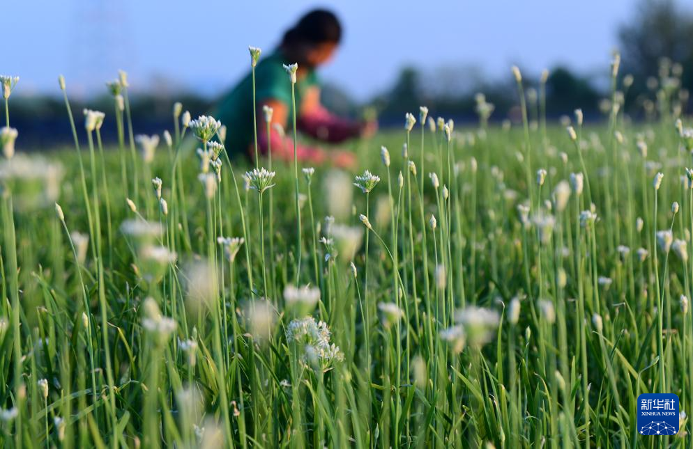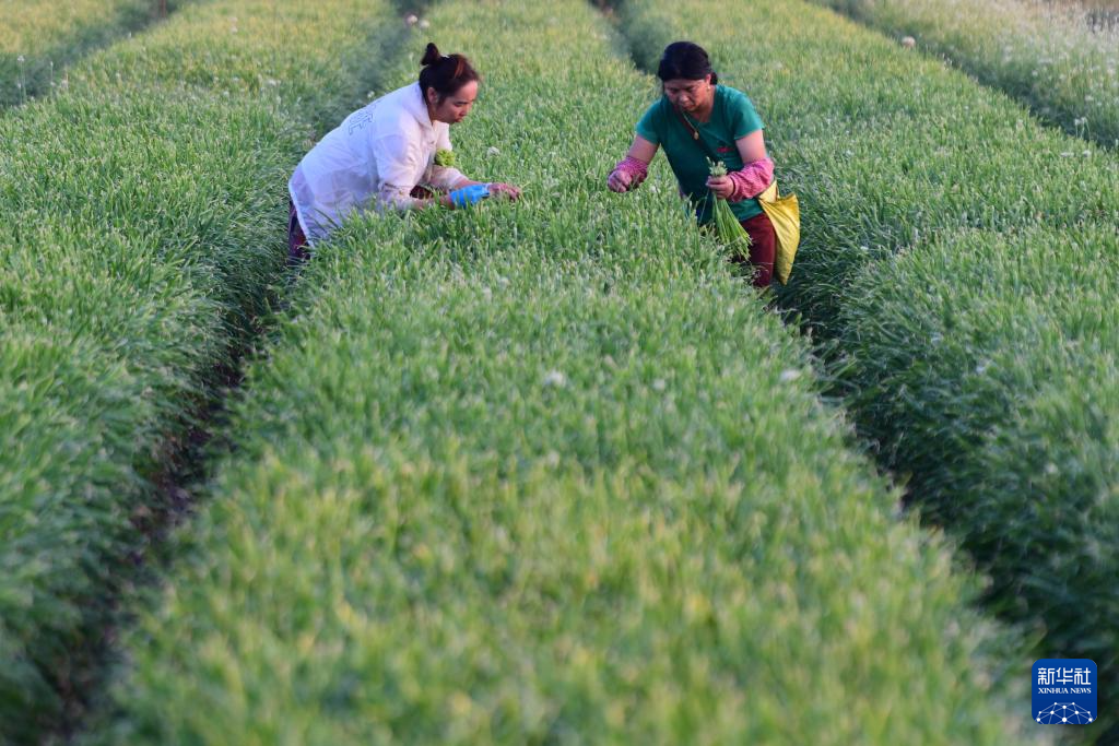 9月6日,采摘工在江苏省无锡市惠山区玉祁街道一处蔬菜种植基地采摘韭菜花。