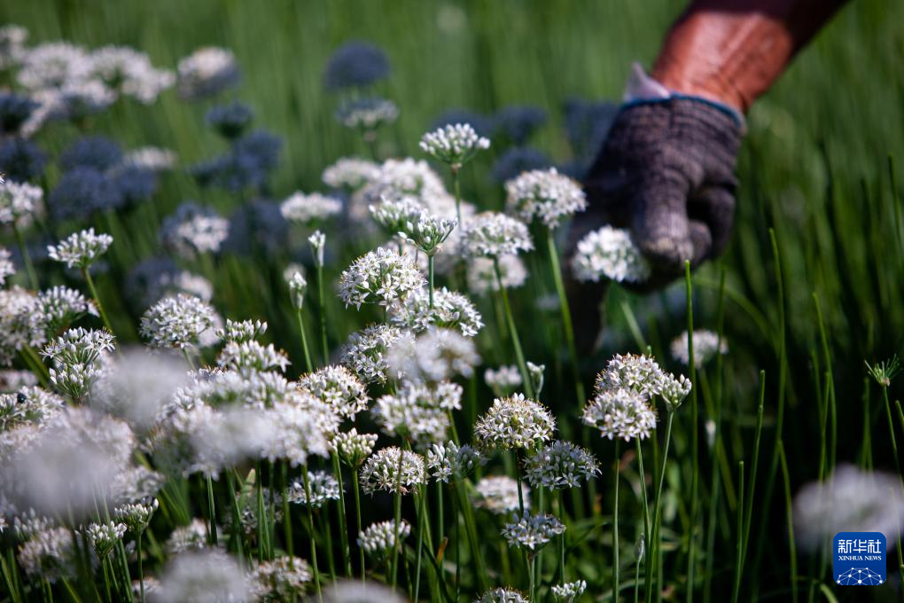 9月6日,农民在山东省淄博市高青县黑里寨镇一处农田里采收韭菜花。