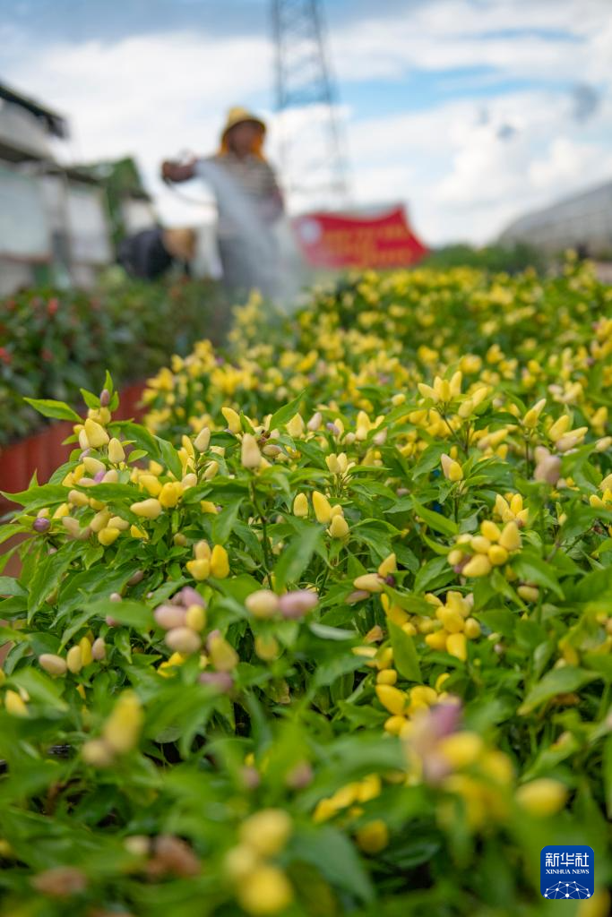 9月6日,村民在云南省文山壮族苗族自治州砚山县农业科技园管理小彩椒。