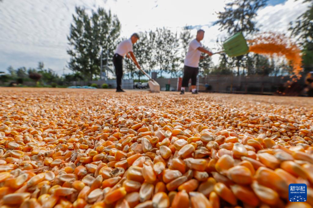 9月6日,河北省遵化市东新庄镇农民在晾晒玉米。