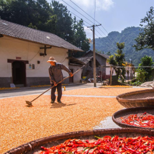 秋日,湖北省宜昌市秭归县的农民将收获的农产品晾晒在房前屋后,构成一幅幅色彩斑斓的山村“晒秋”图。