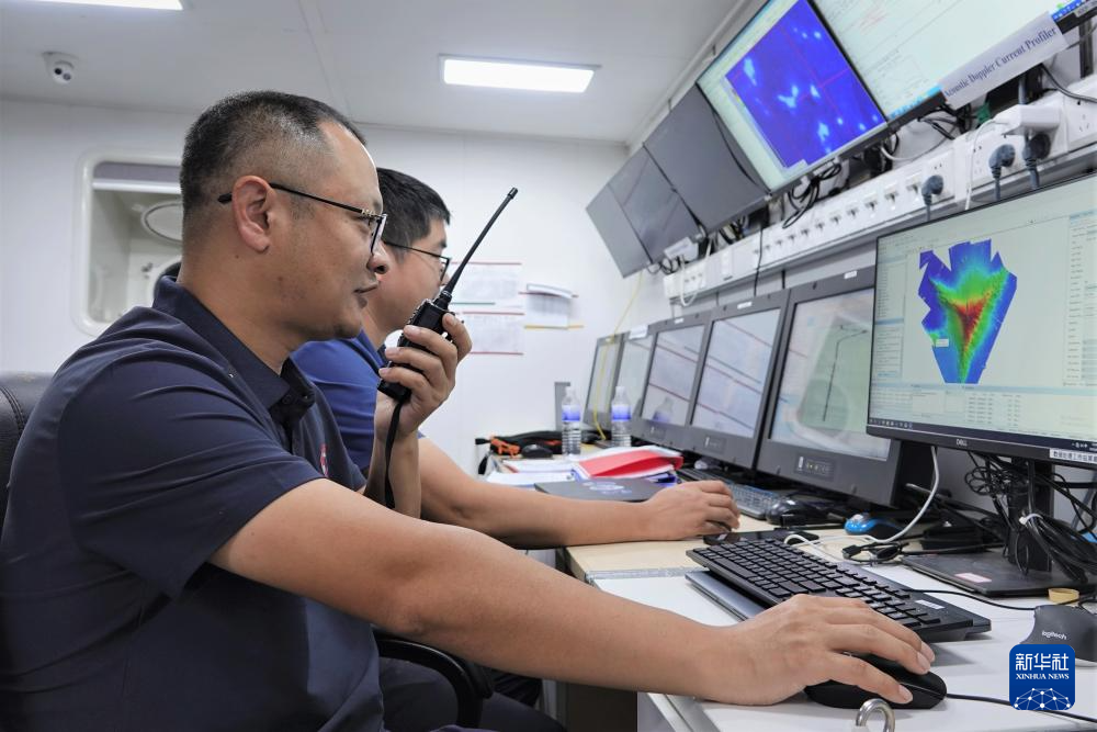 9月6日,“深海一号”船上,装备助理王向鑫在进行多波束测线作业。