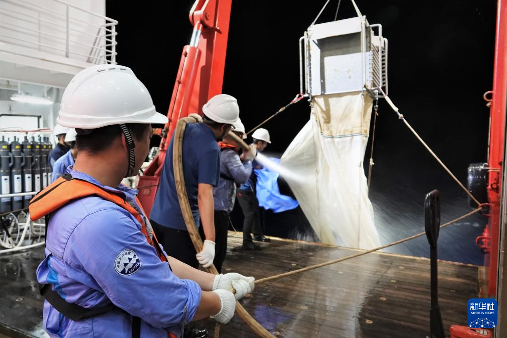 9月6日,“深海一号”船上,科考队员和船员对回收至船上的浮游生物分层拖网设备进行冲洗。