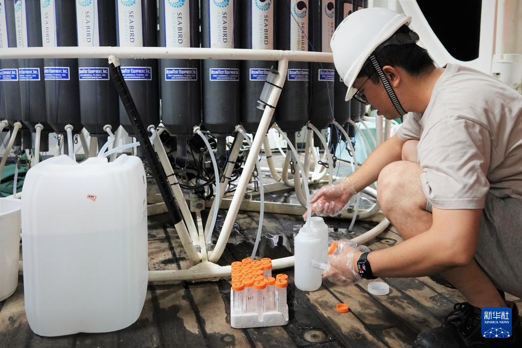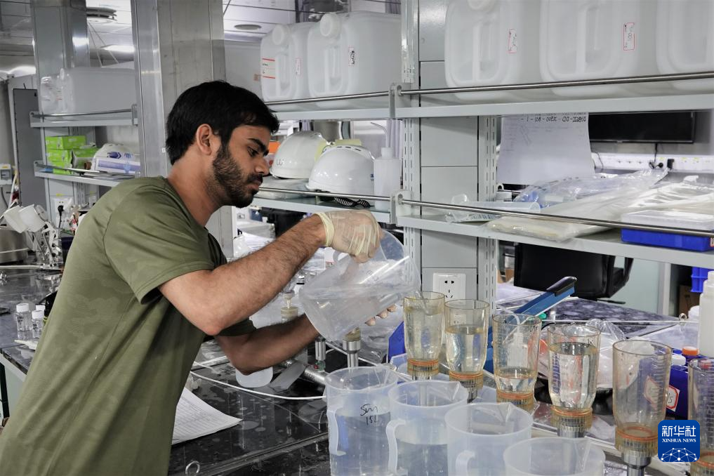 9月6日,“深海一号”船上,来自孟加拉国的科考队员卡里姆对当天采集到的海水样品进行过滤和分析。