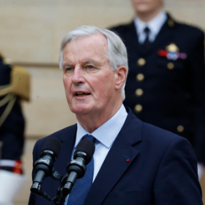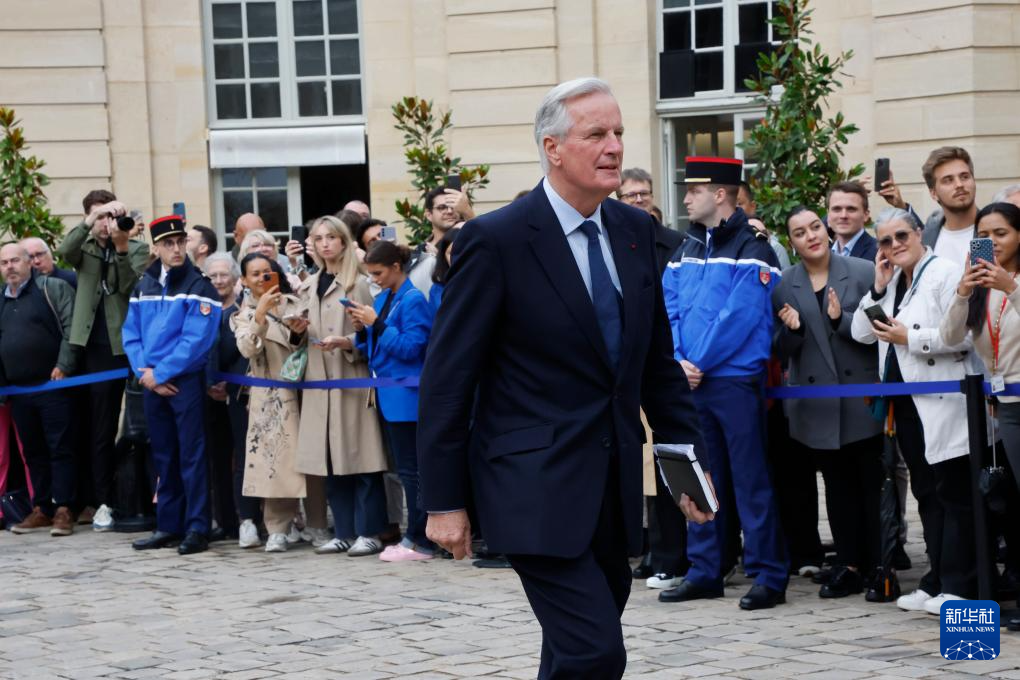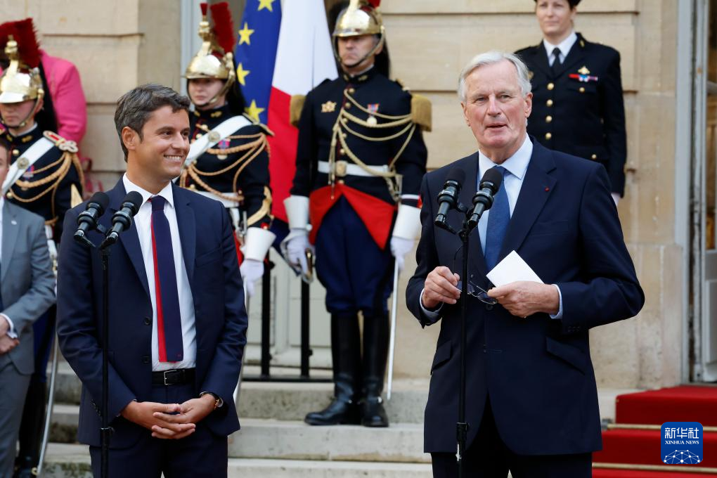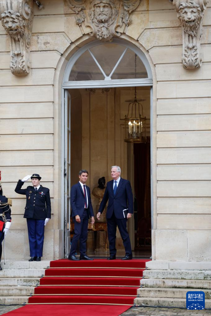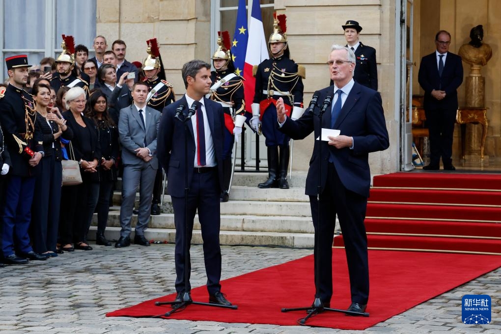 9月5日,在法国首都巴黎的总理府,米歇尔·巴尼耶出席与即将卸任的总理阿塔尔(未在画面中)的交接仪式。