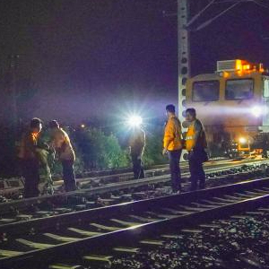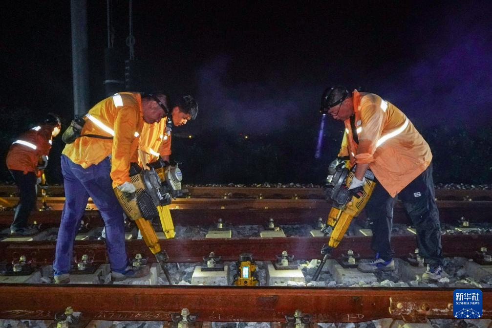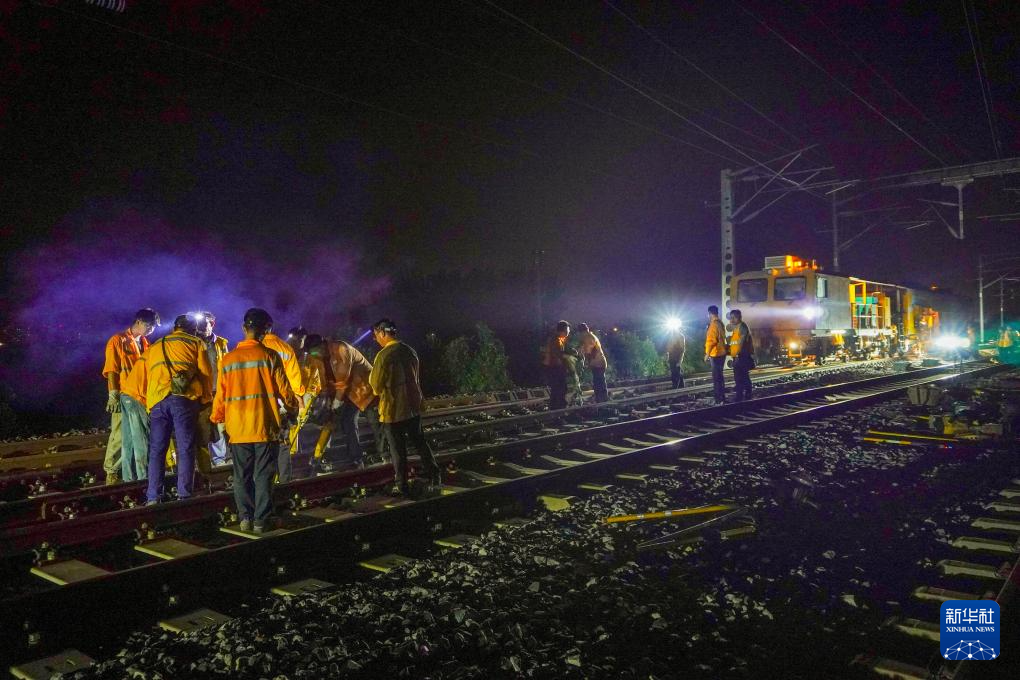 近日,在江苏海门火车站,铁路部门利用大型机械捣固车对宁启铁路进行捣固作业。暑运过后,铁路部门利用夜间不开行列车的天窗时段,对宁启线开展线路大修,保障铁路运行安全。