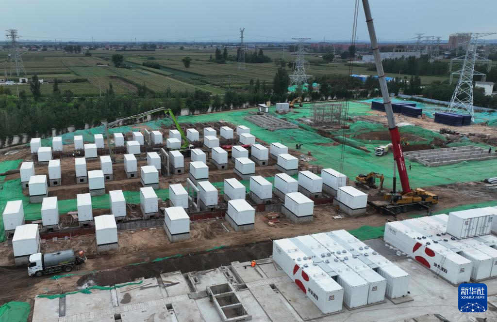 9月6日,工人在位于河北省邢台市信都区的新型电力系统示范工程——独立储能电站项目建设工地施工(无人机照片)。