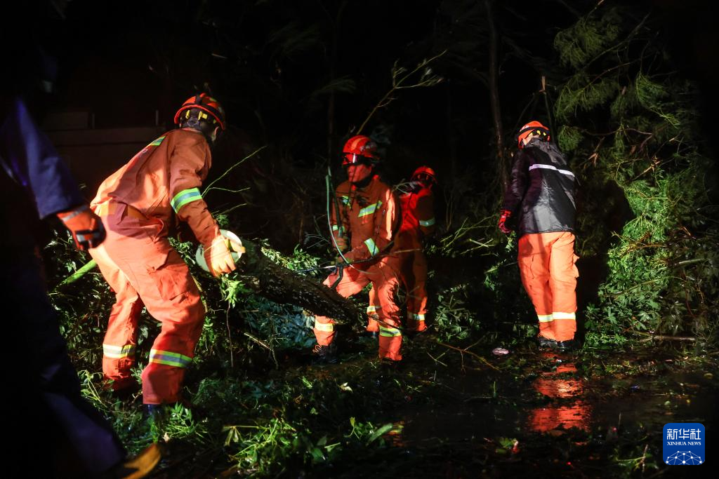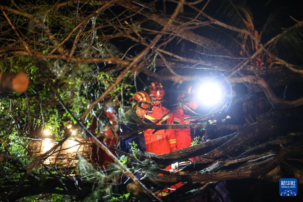 9月7日,在海南文昌市铺前镇,海南消防等应急部门在台风过后的深夜清理路障。