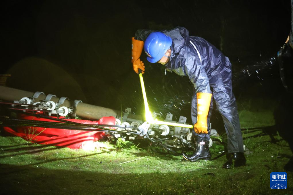 9月6日,在海南文昌市铺前镇,南方电网工作人员在台风过后的深夜清理路障。
