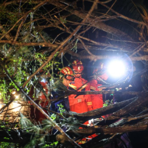 9月6日,在海南文昌市铺前镇,海南消防等应急部门在台风过后的深夜清理路障。