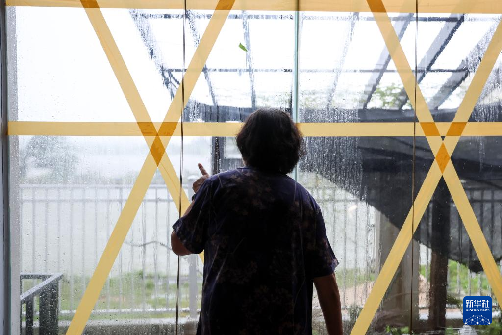 9月6日,在海南文昌市铺前镇,一家民宿店主在台风登陆时望着窗外。