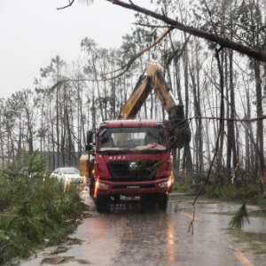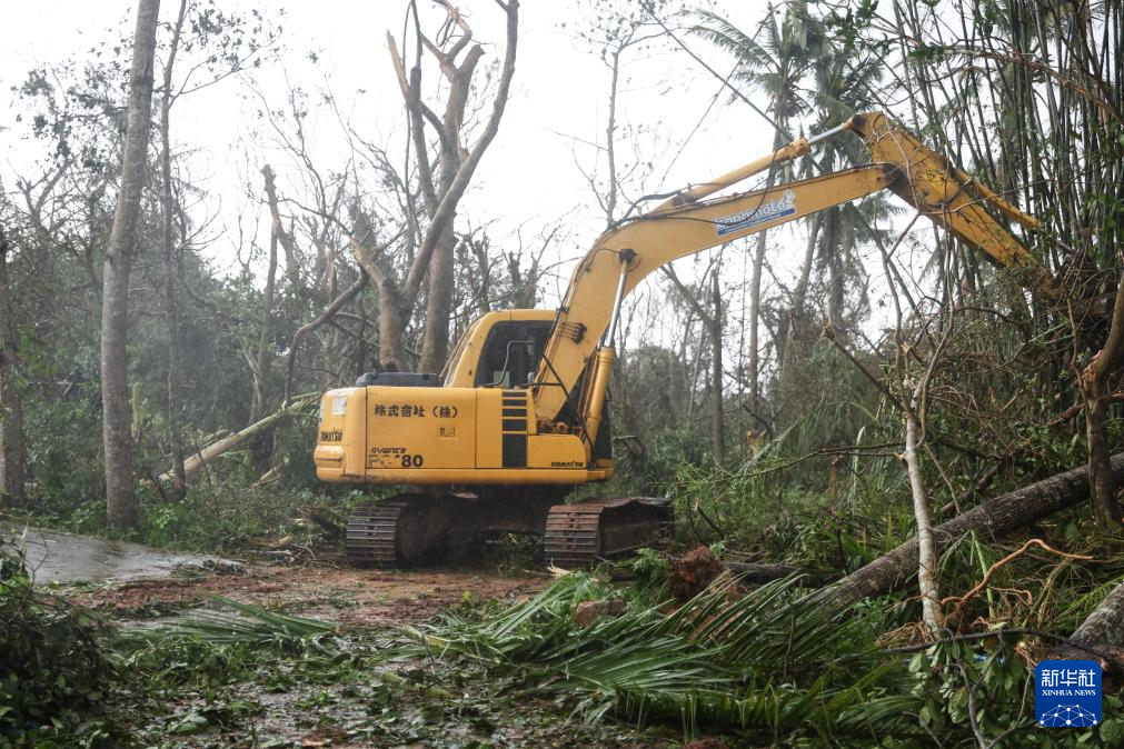 9月7日,在海南省文昌市翁田镇,工程车辆在疏通道路。