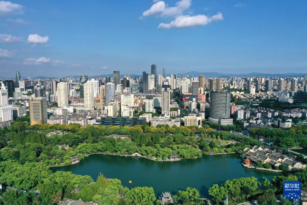 9月5日拍摄的宁波月湖公园及城市建筑群(无人机照片)。