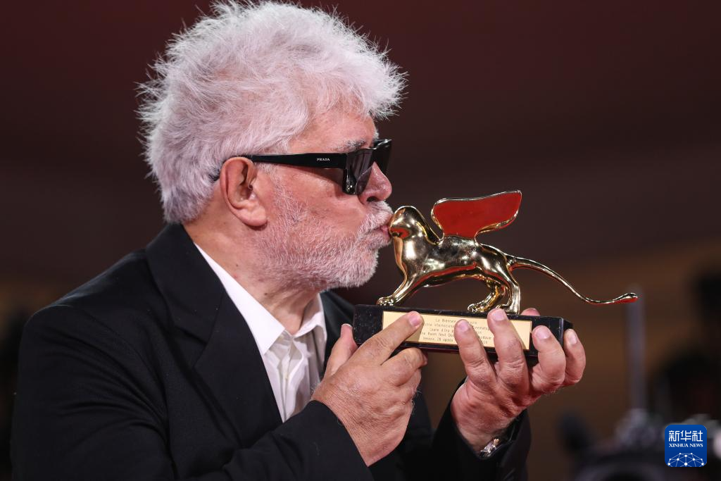 9月7日,在意大利威尼斯,凭借影片《隔壁房间》获得最佳影片金狮奖的西班牙导演佩德罗·阿莫多瓦亲吻金狮奖杯。
