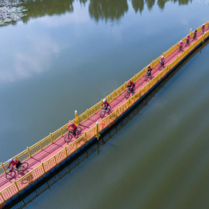9月8日,骑行爱好者在滕州市九龙湾湿地公园健身骑行(无人机照片)。该湿地公园原属一处煤矿塌陷地区域。