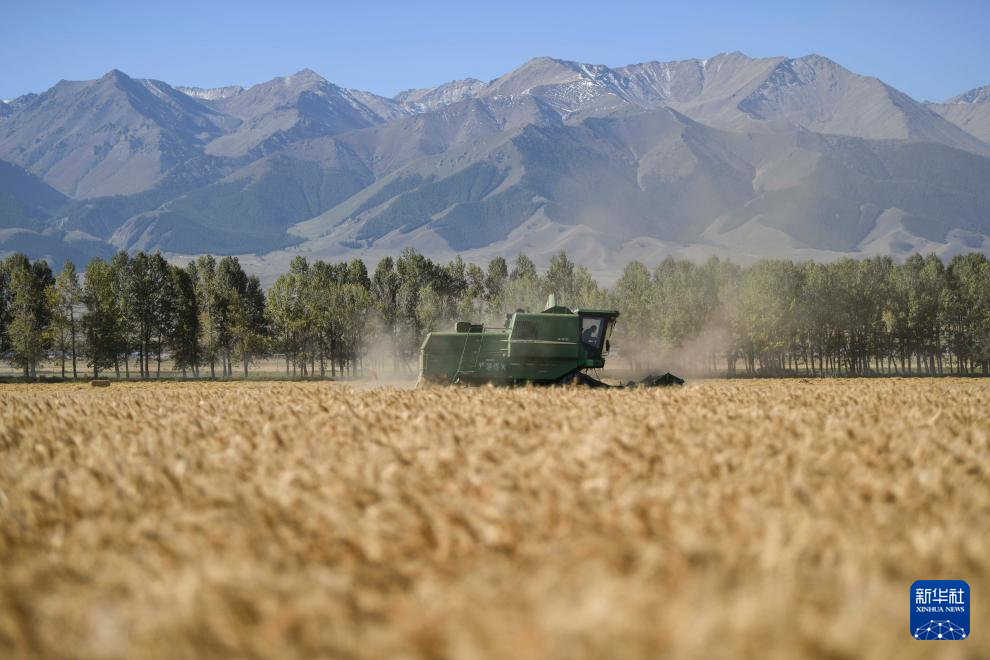 9月7日,农户驾驶收割机在新疆生产建设兵团第十三师新星市红山农场收割小麦。