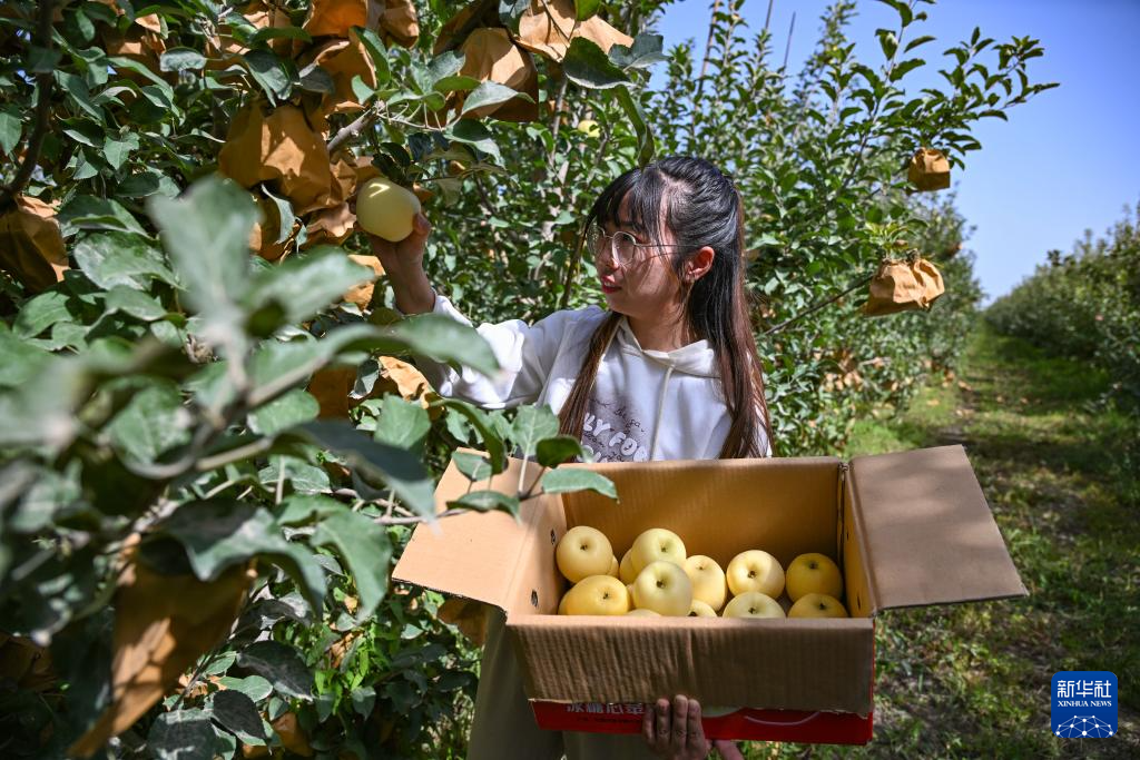 9月6日,新疆生产建设兵团第三师图木舒克市五十四团兴安镇苹果种植户王丹在采收黄金维纳斯苹果。
