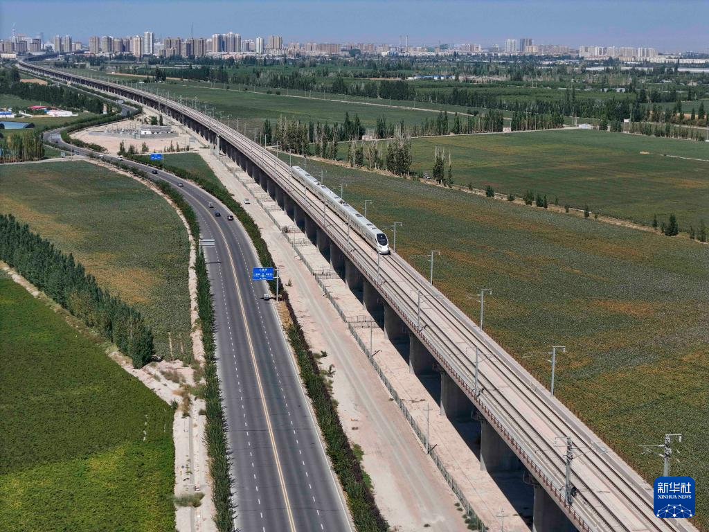 9月9日,动车组列车在新疆生产建设兵团第十三师新星市棉田旁的兰新高铁线上行驶(无人机照片)。