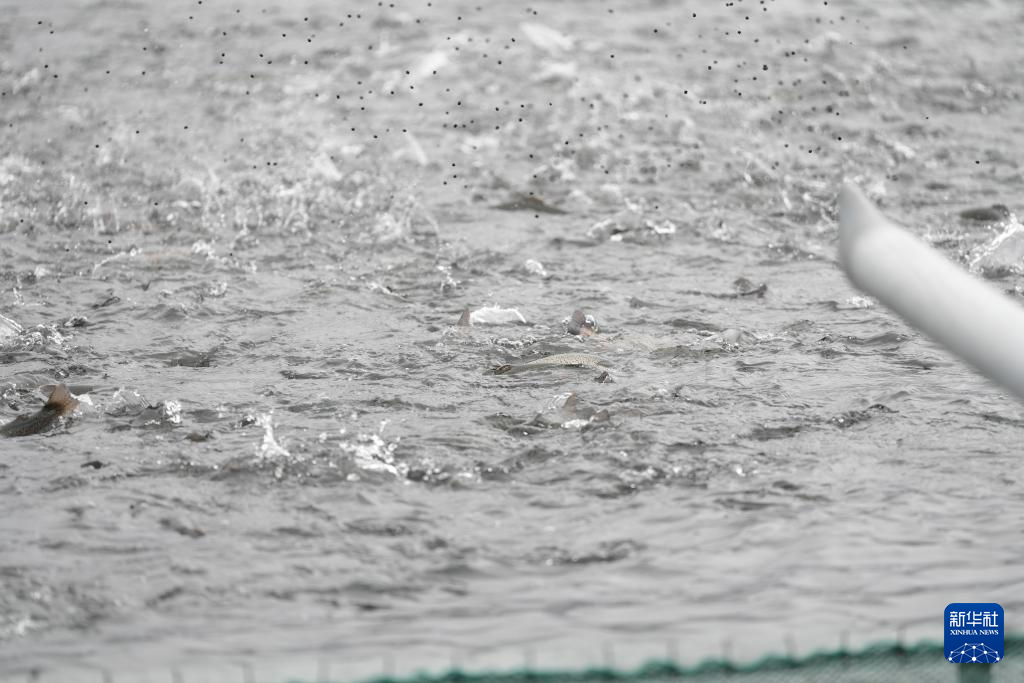 9月7日,新疆生产建设兵团第五师双河市一家渔业养殖基地的自动投料机在撒鱼食。